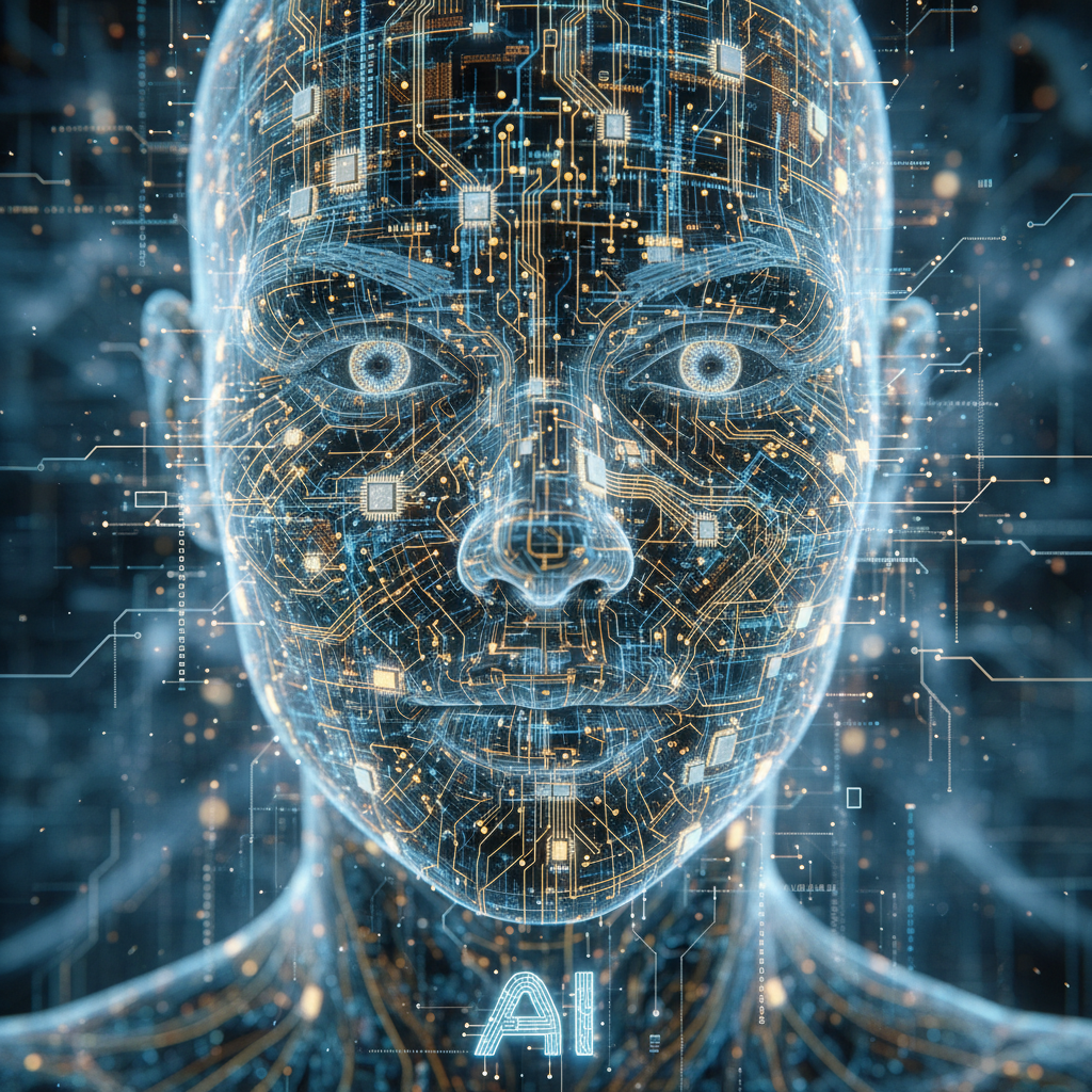 Image: Close-up of abstract neural network visualization, overlaid with a human face silhouette.