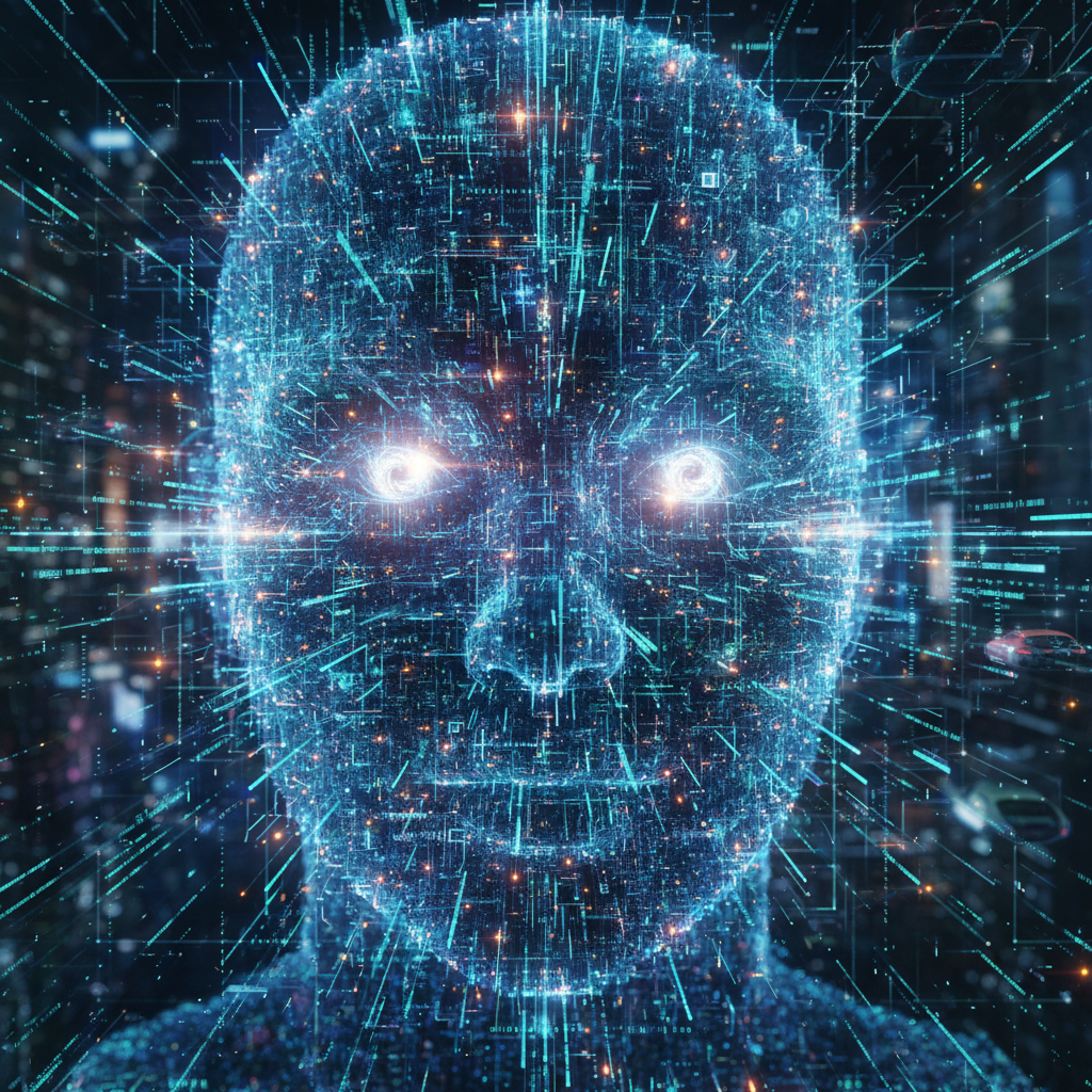 Photo: AI neural networks visualized as data streams forming a human face, illustrating the surreal complexity behind digital memorial technology.
