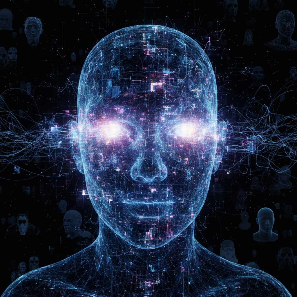 Alt: AI neural network forming human face, symbolizing memory reconstruction.