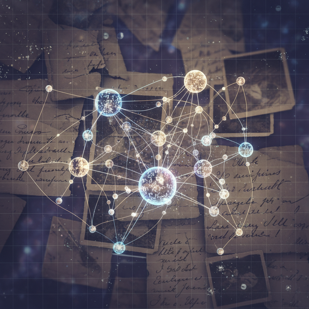Alt: AI network learning from personal memories, illustrating risks and opportunities in digital memorial conversations privacy elderly.